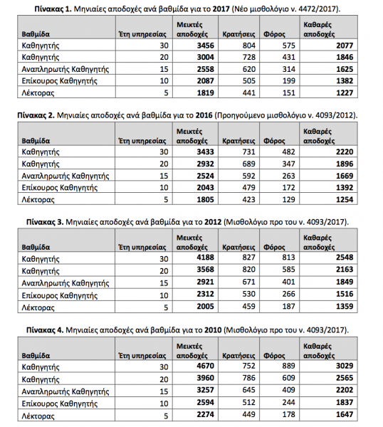 Οι συνολικές μειώσεις που επήλθαν στις αποδοχές των πανεπιστημιακών κατά την επταετία 2010-2017 (βλ. Πίνακα 5) κυμαίνονται στο 20-26% για τις μικτές και στο 23-32% για τις καθαρές αποδοχές, ενώ αν ληφθεί υπόψη και η κατάργηση των δώρων, η συνολική μείωση στις καθαρές αποδοχές ανέρχεται στο 30% - 40% ανάλογα με τη βαθμίδα.