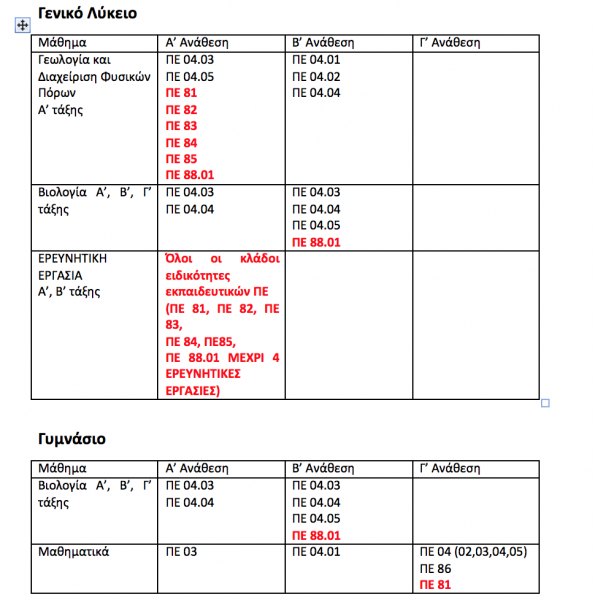 Επιπλέον χάθηκαν οι Α ανάθεση των Χημικών Μηχανικών από το μάθημα της Χημείας και οι Β Αναθέσεις των Γεωπόνων εκπαιδευτικών από το μάθημα της Βιολογίας και στις τρείς τάξης του Λυκείου.