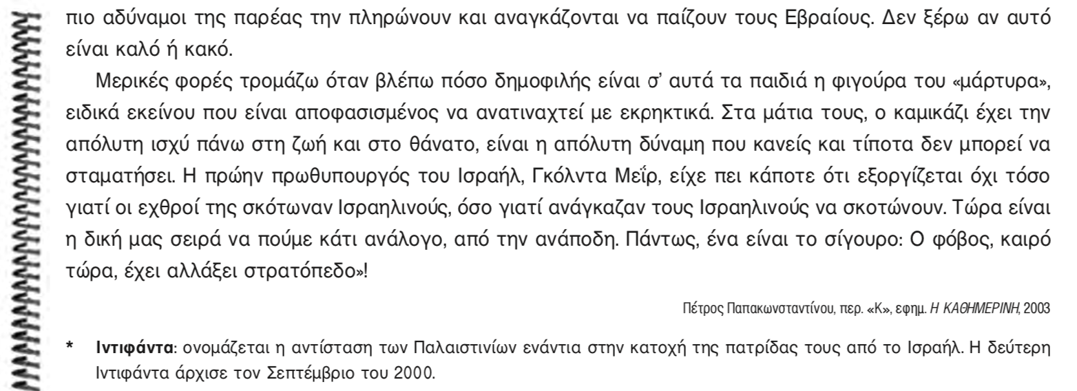 Μεταξύ των δεκάδων αλλαγών που έκανε ο υπουργείο Παιδείας στα σχολικά βιβλία που θα διανεμηθούν τον Σεπτέμβριο στους μαθητές/τριες , διαπιστώνουμε ότι στη Νεοελληνική Γλώσσα της Γ' Γυμνασίου διαγράφεται το άρθρο του δημοσιογράφου Πέτρου Παπακωνσταντίνου στην Καθημερινή με τίτλο "Μια γενιά που της έκλεψαν το χαμόγελο..." και το οποίο αναφέρεται στην Ιντιφάντα .