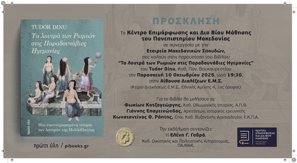 Το Κέντρο Επιμόρφωσης και Διά Βίου Μάθησης του Πανεπιστημίου Μακεδονίας, σε συνεργασία με την Εταιρεία Μακεδονικών Σπουδών, σας καλούν στην παρουσίαση του βιβλίου «Τα λουτρά των Ρωμιών στις Παραδουνάβιες Ηγεμονίες», του καθηγητή του Πανεπιστημίου Βουκουρεστίου, Tudor Dinu.